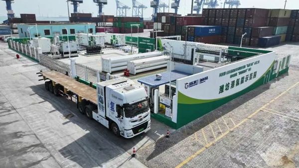 山东省港口集团聚焦绿电全场景深度应用,推动从被动消纳向循环增值转型。在渤海湾港制氢站,依托港区4台6.7MW风电,建成了500kg/12h加氢站、200Nm3/h电解水制氢站和9m3储氢瓶组(可储备300kg压缩氢气),年产绿氢90吨,能满足港区10辆氢燃料电池重卡的每日用氢需求。